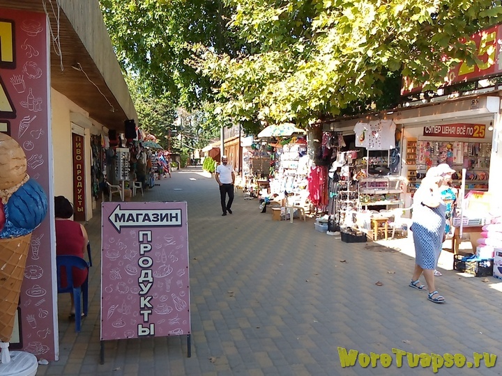 Здесь есть продуктовый магазин, столовая с недорогими комплексными обедами, ларьки со всякой вкуснятиной, курортными принадлежностями и сувенирами, несколько кафе, разные развлечения и игры для детей и взрослых.